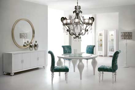 Гостиная «Palermo».  Круглый стол с резными ноками округлой формы, отделка "белый лак". Стулья в том же стиле станут хорошим дополнением к столу, образуя полноценную обеденную группу. Цена: стол обеденный 61 350 руб., стул 25 705 руб.