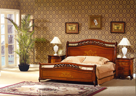Достойная , изящная спальня — прекрасный образец чисто классического стиля. Отличительная особенность: -использование натуральных материалов — все элементы декорированы ажурной резьбой — инкрустация -благородный цвет покрытия — два вида шкафа -гнутые декоративные элементы