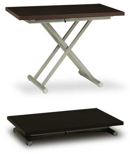 Стол-трансформер «Up&under» Стол-трансформер позволяет изменять высоту стола от 23см до 83см, т.е. от высоты низкого журнального стола до высоты барной стойки. Стол имеет двойную столешницу, которая поворачивается вокруг центральной оси на 90 градусов и раскладывается до размеров 140х110см. Стол имеет скрытые колесики, которые позволяют его легко перемещать. Материалы: дерево, металл. Цвет - венге. Размеры: 110x70 (140x110)см, высота 23-83см. цена 23000